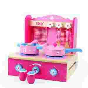 Wykonana w całości z drewna, różowo niebieska dziecięca kuchnia o niewielkich wymiarach lecz zawierająca wszystko to co jest potrzebne aby ugotować obiad dla ukochanych lal i misiów. Kuchenka posiada dwa palniki oraz trzy pokrętła z funkcją klikania podczas ich przekręcania. W zestawie znajdują się także patelnia, garnek z pokrywką, trzy mieszadła, a także solniczka i pieprzniczka.