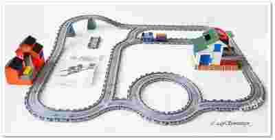 Torów jest dużo, można je dowolnie konfigurować. Ładownia ma w komplecie baterie. W sprzedawanym zestawie nie ma wagonika widocznego na zdjęciach oraz żółtego sianka. Jest komplet torów, budynki, podpory estakady, Tomek i 2 pomarańczowe beczki. Są też łączniki do torów starszego typu. Całość w świetnym stanie, z minimalnymi śladami zabawy.