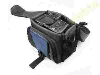 Elegancka, wytrzymała, lekka torba na Duży Kompaktowy Aparat Cyfrowy lub kamerę cyfrową - Dedykacja do aparatu: Duży Kompakt / Zoom / Mała Lustrzanka; Pasek na ramię; Ilość kieszeni/przegródek: 4; Rodzaj materiału: Nylon; Waga: 379g; Kolor: Czarno-Niebieski.