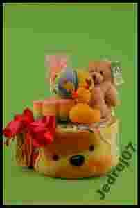 Przedmiotem aukcji jest ręcznie wykonany, jedyny w swoim stylu tort z oryginalnych Pampersów, kocyka, maskotki, gąbki-myjki, piłki-grzechotki i kaczuszki do kąpieli!