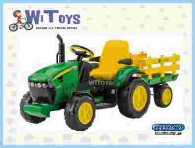 Traktor z odczepiana przyczepą jednoosiową i cyfrowym radiem FM, włoskiej firmy Peg Perego na licencji John Deere (IGOR0047), napędzany akumulatorem 12V. Jest to jednoosobowy traktor dla dzieci od 3 lat. Traktor posiada napęd na dwa tylne koła, pokonuje wzniesienia do 10 %, posiada nożny pedał gazu i hamulca (pojazd staje gdy dziecko puści pedał gazu-hamulec i gaz w jednym pedale), dwa biegi prędkości do przodu (bieg drugi- szybki można zablokować aż dziecko nie nauczy się dobrze jeździć, służy do tego specjalna blokada) i bieg wsteczny. Traktorek ten to wymarzony prezent każdego dziecka. Pojazd ten sprawi iż twoje dziecko spędzi więcej czasu na świeżym powietrzu. Traktorek posiada regulowane siedzenie przód-tył dzięki czemu można jego ustawienie dopasować do wzrostu dziecka, po bokach siedzenia znajdują się ruchome podłokietniki. Zachwyca on jakością wykonania i dbałością o szczegóły wykończenia. W zestawie znajduj się ładowarka. Specyfikacja: długość 171 cm, szerokość 63 cm, wysokość 69 cm, obciążenie traktora 40 kg + 10 kg przyczepa, wiek dziecka + 3 lata.