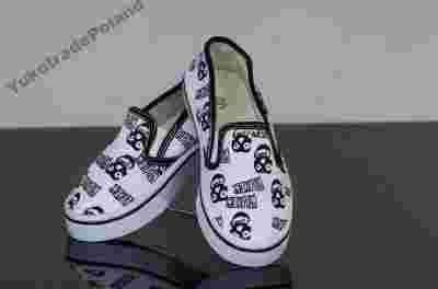Białe wsuwane półtrampki zdobione trupimi czaszkami.