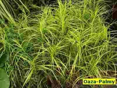 Gatunek o zupełnie innym wzroście, niż pozostałe turzyce. Wykształca wyprostowane łodygi, które są promieniście pokryte liśćmi i wyglądają dzięki jak miniaturowe palmy. Naturalnie rośnie na terenach podmokłych, idealna trawa ozdobna do posadzenia przy oczku wodnym