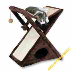 Bardzo elegancko wykończony drapak dla kotów. Podstawę stanowi duża i szeroka budka, której górne ściany połączone są przez wygodny hamak a z boku pokryto go szeroką sizalową powierzchnią do drapania, a całość obszyto mieciutkim pluszem.