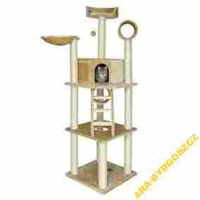 Bardzo elegancko wykończony i rozbudowany drapak dla kotów. Zawiera jedną, dużą i stabilną podstawę, aż trzy tarasy do leżenia, ogromną budkę, hamak, dwa tunele oraz drabinkę. Wszystko pokryto miękkim i przyjemnym pluszowym futerkiem. Dziesięć, odpowiednio rozmieszczonych grubych, wykończonych sizalową linką pieńków do drapania, zapewnia kociemu drzewku stabilność. Drapak wyposażono ponadto w zabawkę na elastycznej gumce, którą koty uwielbiają atakować.