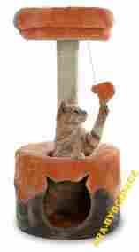 Bardzo dużą zaletą drapaka jest jego okrągła budka. Duża, wyściełana wewnątrz i na zewnątrz miękkim i przyjemnym pluszem, stanowi idealne miejsce dla odpoczynku i relaksu, a także zapewnia drapakowi stabilność. Posiada 2 otwory: z frontu i na górze.