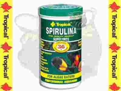 Spirulina Super Forte 36% firmy Tropical pokarm płatkowany z wysoką zawartością (36%) glonów Spirulina platensis jest jednym z najcenniejszych środków żywieniowych opracowanych dla potrzeb akwarystyki profesjonalnej. Zalecany w szczególności dla glonożernych pielęgnic afrykańskich oraz jako dieta uzupełniająca dla ryb roślinożernych i innych ryb o wysokich wymaganiach pokarmowych (w tym morskich). Glony Spirulina platensis są sprawdzonym, wysokowartościowym suplementem żywieniowym stosowanym zarówno w diecie człowieka jak i specjalnych produktach paszowych przeznaczonych dla zwierząt. Spirulina wpływa bardzo korzystnie na prawidłowe funkcjonowanie żywych organizmów, poprawia metabolizm, wzmacnia siły odpornościowe. Zawarte w niej naturalne karotenoidy, przechodzące w trakcie przemian w astaksantynę, uwydatniają znacznie pigmentację, aktywizując ksantofory i erytrofory. Glony Spirulina platensis dostarczają również wysokowartościowych naturalnych białek, aminokwasów, nienasyconych kwasów tłuszczowych, witamin i minerałów w wyjątkowo łatwo przyswajalnych związkach kompleksowych, co ma znaczący wpływ na zdrowotność