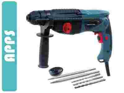 3 wiertła, 2 dłuta, rękojeść boczna, ogranicznik głębokośći, ,kufer transportowy