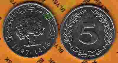 TUNEZJA /KM-348/ 5 MILLIM 1997 Al. Stan Monety -I