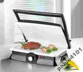 Grill kontaktowy, stołowy do szybkiego przygotowywania ryb, mięsa, warzyw, kanapek oraz innych przekąsek. Ruchomo zamontowana płyta górna dopasowuje się do rozmiaru potrawy. Oferuje podwójną powierzchnię do grillowania. Płyta odporna na przywieranie. Dokładne, beztłuszczowe grillowanie, praktyczne szczeliny odprowadzające tłuszcz. Temperatura regulowana - dioda kontrolna. Praktyczny rozmiar grilla. Urządzenie łatwe w czyszczeniu.