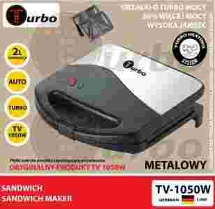 TV-1050W / TV 1050W FIRMY TURBO ŁATWY W CZYSZCZENIU - WYSTARCZY PRZETRZEĆ WILGOTNĄ SZMATKĄ WYKONANY Z WYSOKIEJ JAKOŚCI STALI SZLACHETNEJ AUTOMATYCZNY REGULATOR TEMPERATURY SPECIALNA TURBO OCHRONNA POWŁOKA ANTYADHEZYJNA UCHWYT Z IZOLACJĄ TERMICZNĄ TURBO HEATING SYSTEM SYSTEM ZAMYKAJĄCY 2 LAMPKI KONTROLNE WSKAŹNIK STANU UPIECZENIA OCHRONA PRZED PRZEGRZANIEM INSTRUKCJA W JEZYKU POLSKIM