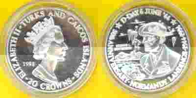 TURKS AND CAICOS 20 CROWNS 1994r Ag.