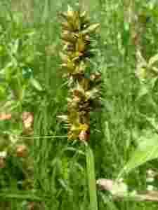 Zebrane w 5–8 kłosów tworzących podłużny, nieregularnego kształtu kłos zbiorowy. W dolnej części jest on luźny, górą gęściejszy. W szczycie kłosów znajdują się kwiaty męskie. Podłużnie jajowate pęcherzyki mają ciemnordzawy kolor, długość 4–5 mm, brzegi silnie i gęsto ząbkowane i 6–7 niewyraźnych nerwów. Są wypukłe z przodu a wklęsłe z tyłu i zakończone dwoma wyraźnymi ząbkami. Pod mikroskopem można dostrzec, że komórki skórki pęcherzyków mają długość podobną, jak i szerokość i ściany komórkowe silnie zgrubiałe. Słupki z 2 znamionami.