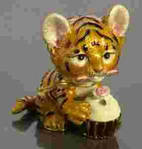 Urocza szkatułka w kształcie małego tygryska, trzymającego w łapkach ciasteczko – babeczkę. Przepiękny produkt kolekcjonerki, wykonany współcześnie w nawiązaniu do dzieł słynnego jubilera i złotnika Petera Carla Faberge (1[zasłonięte]846-19). Szkatułka posiada magnetyczne zamykanie oraz upominkowe opakowanie.