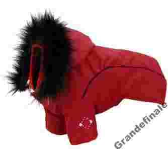 Kurtka czerwona z czarnymi dodatkami z kapturkiem i rękawkiem, z zewnątrz ortalion nie przemakalny pod spodem polar, zapinana na napki pod brzuszkiem. Kaptur z futerkiem można odpiąć..