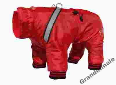 Kombinezon zimowy czerwony z czarnymi dodatkami.Z zewnątrz ortalion wodoodporny, pod spodem jako podszewka polar. Zapinany na plecach na zamek, pod zamkiem szeroka listwa ułatwiająca zapinanie. Do kombinezonu doszyte szelki odblaskowe służące do przypięcia smyczy. Doskonałe na zimowe spacery.