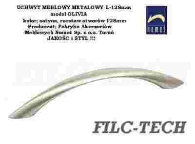 Nowe solidnie wykonane uchwyty meblowe przez renomowanego polskiego producenta Fabrykę Akcesoriów Meblowych NOMET Sp. z o.o. w Toruniu. Model OLIVIA G5. Rozstaw otworów 128mm. Długość całkowita 163mm, wysokość 23,5mm, szerokość 13mm. Kod powłoki galwanicznej producenta SATYNA (G5). Wkręty mocujące uchwyt (M4x25mm) w komplecie. Na naszych aukcjach dostępne są różne modele uchwytów do mebli. Cena na aukcji za 1 sztukę.