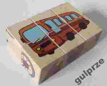 Zestaw 6 drewnianych sześcianów z obrazkami. Na każdej ścianie klocka znajduje się element innego obrazka. Prawidłowo ułożone dają 6 różnych możliwości ułożenia obrazków.
