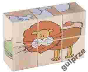 Zestaw 6 drewnianych sześcianów z obrazkami. Na każdej ścianie klocka znajduje się element innego obrazka. Prawidłowo ułożone dają 6 różnych możliwości ułożenia obrazków.