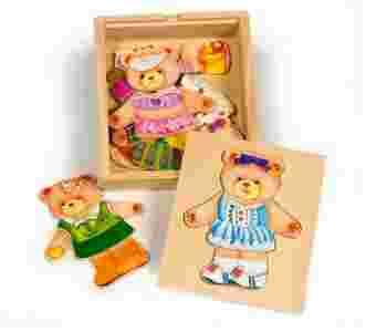 Coś dla małej modnisi ! Drewniane pudełko zawiera planszę, do której można wymiennie dopasowywać misie w różnych strojach.