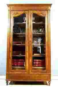 Majestatyczna wytworna orzechowa sylwetka wspiera się na profilowanych nóżkach. U dołu znajduje się szeroki cokół z szufladą, nad nim para drzwi z witrynami ujętymi w uroczą profilowaną ramkę, boki szyb fazowane. Mebel zakończony jest szerokim ozdobnym gzymsem. Całość wykonana z drewna orzechowego, boki i drzwi oklejone dekoracyjnym fornirem. Wewnątrz znajdują się 4 regulowane półki i 1 półka z szufladą.