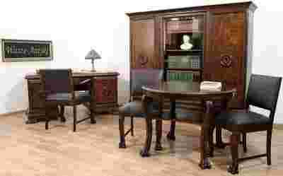 z jednakowo zdobionym biurkiem,