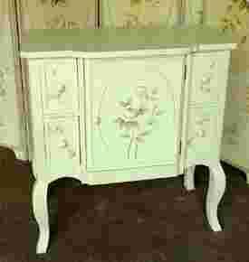 Zdobiona ręcznie malowanymi, romantycznymi gałązkami róż. Powierzchnia bardzo lekko patynowana (delikatne przetarcia, niewielkie domalowania i przemalowania).