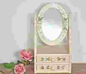 Przepiękna toaletka w stylu prowansalskim. Obrotowe lustro umieszczone jest na małym postumencie, w którym znajdują się dwie szufladki na różne drobiazgi.