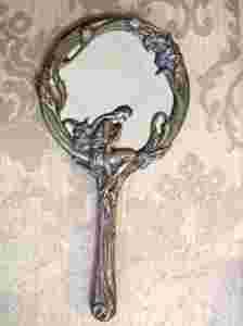 Na awersie tafla lusterka w przepięknej ramie z wizerunkiem kobiety otoczonej bogactwem motywów roślinnych typowych dla sztuki końca XIX i początku XX wieku. Na rewersie zachwycająca kompozycja popiersie kobiety oplecione kwiatami i wijącą się roślinnością.