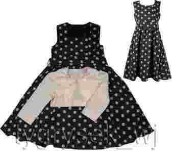 Sukieneczka jest w białe grochy na granatowym tle nakrapianym maleńkimi groszkami.