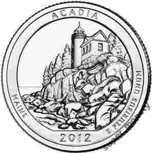 Reverse Designer: Barbara Fox Engraver: Joseph Menna Description: Depicts a view of the Bass Harbor Head Lighthouse and Acadia's rough coastline. Inscriptions are ACADIA, MAINE, 2012 and E PLURIBUS UNUM.