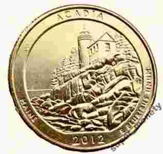 Reverse Designer: Barbara Fox Engraver: Joseph Menna Description: Depicts a view of the Bass Harbor Head Lighthouse and Acadia's rough coastline. Inscriptions are ACADIA, MAINE, 2012 and E PLURIBUS UNUM.