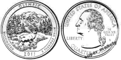 Designer: Susan Gamble Engraver: Michael Gaudioso Description: Depicts a Roosevelt elk standing on a gravel river bar of the Hoh River with a view of Mount Olympus in the background. Inscriptions are OLYMPIC, WASHINGTON, 2011 and E PLURIBUS UNUM.