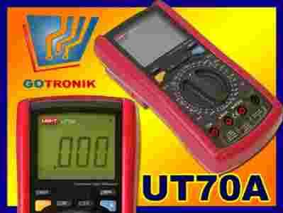 UT70A to uniwersalny multimetr cyfrowy. Umożliwia wszystkie podstawowe funkcje pomiarowe: woltomierz, amperomierz, omomierz, pomiar pojemności, indukcyjności, częstotliwości, temperatury, pomiar stanów logicznych, współczynnika hfe tranzystorów, akustyczny tester ciągłości ... Przyrząd umieszczony jest w bardzo praktycznym holsterze, który zwiększa odporność na uszkodzenia mechaniczne, a także pozwala umieścić w nim przewody pomiarowe.