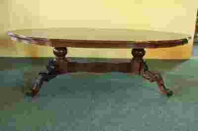 Niespotykana, włoska, orzechowa ława stylizowana na barok. Mebel jest wyjątkowo duży - 180 cm x 101 cm, z profilowaną listwą pod blatem, toczonym trzonem i bogato rzeźbionymi, skośnymi nogami.