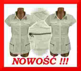 Fajna koszula uszyta z miłego w dotyku delikatnie rozciągliwego materiału. Z przodu zapinana na guziki. Jest odcinana powyżej talii, z tyłu w odcięciu wszyta delikatna gumka. Rękaw krótki, kołnierzyk wykładany. Na ramionach guzik i szlufka. U góry ma imitacje kieszonek zapinanych na guziki, natomiast u dołu ma aż trzy rodzaje kieszonek w jednej - dwie różne wkładane i jedna zasuwana na suwak. Dół solidnie wykończony tasiemką. Zgrabna, idealnie układa się na sylwetce. Jest bardzo wygodna.