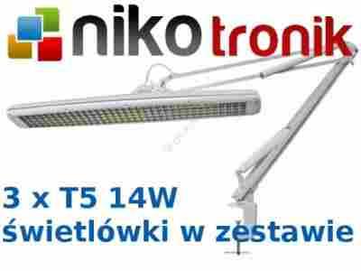 Wysokiej jakości lampa mocowana do blatu doskonale sprawdzi się na stanowiskach pracy wymagających intensywnego oświetlenia. Jest bardzo estetyczna więc świetnie nada się do gabinetów kosmetycznych i lekarskich. Lampa jest wyposażona w 3 świetlówki T5.