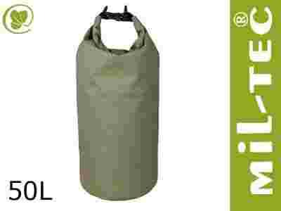 Transportowy worek firmy Mil-Tec wykonany został z wytrzymałego, gumowanego trójlaminatu PVC. Materiał ten zapewnia wytrzymałość worka na różnego rodzaju przecięcia czy otarcia. Guma natomiast zapewnia całkowitą wodoodporność worka oraz niezatapialność nawet przy pełnym wypełnieniu wnętrza. Szwy worka uszczelnione zostały galwanizowaną, nylonową lamówką, która zapewnia doskonałą wytrzymałość. Model zamyka się za pomocą usztywnianej listwy, którą trzeba zrolować i zapiąć klamrą, która znajduje się na końcach listwy. Po zapięciu listwa z klamrą służyć może jako uchwyt do przenoszenia bagażu. Przy klamrze znajdują się również D-ringi, które wykonane są z tworzywa ABS, dzięki którym można worek przypiąć na przykład do kajaka, czy pontonu. Po złożeniu uzyskamy kompaktowy kształt, który zmieści się bez problemu w plecaku.