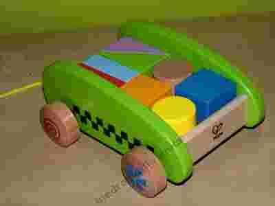 Przedmiotem aukcji jest mały wózek z klockami firmy Hape.