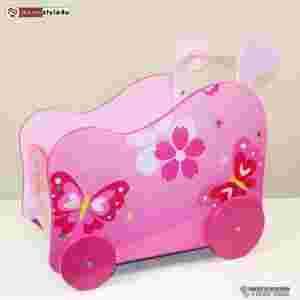 Drewniany wózek do przewożenia zabawek dla dziecka w kolorze różowym w motywie z motylem
