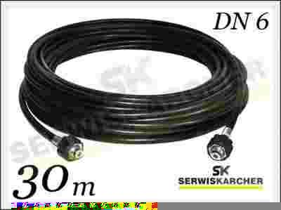 Wąż - przedłużka wysokocisnieniowa o długości 30m i średnicy DN6, pasuje do myjek ciśnieniowych firmy KARCHER z serii K 2-7. Wąż w oplocie nylonowym, jest elastyczny i wytrzymał a jego końcówki zostały trwale i precyzyjnie zakute z obu stron standardową nakrętką M22x1,5.