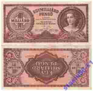 Największą hiperinflacją w historii była hiperinflacja na Węgrzech po zakończeniu II wojny światowej[2], gdzie w 1946 roku największym nominałem był banknot 100 [zasłonięte] 000 000 [zasłonięte] 000 000 (100 trylionów, gdzie trylion to jedynka z 18 zerami) pengő (przygotowano już do wprowadzenia banknot o nominale miliard bilionów, tj. jedynka z 21 zerami; zamiast opisu cyfrowego na banknocie znajdowało się oznaczenie „Egymilliárd B.-pengő”[3]), a inflacja wyniosła 41 [zasłonięte] 000 000 [zasłonięte] 000 (41,9 biliarda) % w skali miesiąca, co oznaczało podwajanie się cen przeciętnie w ciągu każdych 15 godzin. Gdy w sierpniu 1946 roku wprowadzono tam forinta, przyjęto przelicznik 1:400 [zasłonięte] 000 000 [zasłonięte] 000 000 [zasłonięte] 000 000, co oznacza, iż jeden forint otrzymał wartość czterystu tysięcy kwadrylionów (gdzie kwadrylion to jedynka z 24 zerami) pengő.