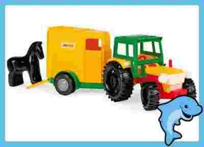 Traktor z przyczepą na konia należy do serii COLOR CARS – kolorowych, wytrzymałych i solidnie skonstruowanych samochodów. Można się nim bawić nie tylko w domu, ale i poza nim, na przykład w piaskownicy. Pojazd ma 38,5 cm długości. Wyposażono go w ruchome elementy (podnoszona kabina i pokrywa silnika, ruchoma skrzynia ładunkowa), które czynią zabawę jeszcze ciekawszą. Plastikowy model bardzo realistycznie odzwierciedla wygląd prawdziwego traktora. Przeznaczony jest, zgodnie z zaleceniami producenta, dla dzieci powyżej 3. roku życia. Jego elementy wykonano z wysokiej jakości tworzywa sztucznego. Są one nietoksyczne, bezpieczne i wytrzymałe. Pojazd zapakowano w folię termokurczliwą.