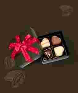 Pudełeczko zawiera cztery pralinki w kształcie serca, wypełnione pysznym nadzieniem w czterech smakach o łącznej wadze netto min. 50g.