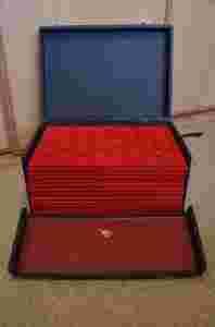 Razem z walizą w zestawie sprzedaję 17 szt palet na monety. Palety są sztywne, zrobione z twadego PCV, oklejone eleganckim czerwonym welurem. Większość palet było używanych do przechowywania zlikwidowanej kolekcji numizmatycznej, część była kupiona na zapas i jest całkowicie nowa!!! Wymiary wszystkich palet: 330 x 220 mm 5 szt palet na 32 polskie lustrzanki 10 zł Ag w standardowym kapslu. Na 5 paletach można zatem zmieścić razem 160 szt numizmatów. Stan zachowania przedstawia poniższe zdjęcie: