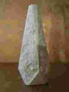 Wykonany w niezwykle ciekawej formie, wpadającej w ostrosłup. Typowa dla designerskich wyrobów Kaisera nieregularna powierzchnia. Nieregularności widoczne również od wewnętrznej, szkliwionej strony. Dodatkowo zdobiony doskonale wkomponowanymi wizerunkami wyrastających ze skały kryształów.