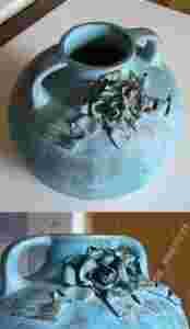 Przedstawiam wazon ceramiczny (przecierany) ozdobiony różą wykonaną ze sztywnej tkaniny. Naczynie posiada specyficzny, romantyczny charakter. Wymiary (szer. x wys.): 20 x 20 cm. Umiarkowane ślady użytkowania.