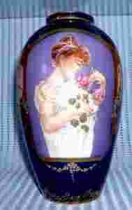 Wazon jest wykonany z bialej, delikatnej porcelany, utrzymany w odcieniu niebiesko-fioletowym, bardzo bogato zlocony. Przyozdobiony portretem kobiety z roza