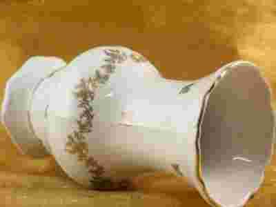 Wazon wykonany z doskonałej jakości,bielutkiej porcelany o romantycznym kształcie.Korpus upiększono rzutami oraz girlandą roślinną w złocie.Całość dopieszczono reliefem wkomponowanym pod górną krawędzią wylewu i nad krawędzią podstawy.