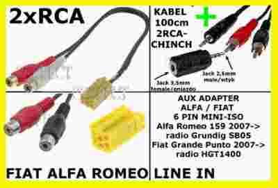 INTERFEJS ZAKOŃCZONY JEST Z JEDNEJ STRONY WTYCZKĄ DO RADIA FIAT , ALFA ROMEO A Z DRUGIEJ STRONY KABEL 2XRCA o długości ok 20-25cm + DODATKOWY KABEL 100cm + przelotka.